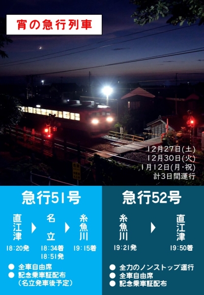 ・ 復路となる「急行52号」では糸魚川-直江津間ノンストップ運行を行います。