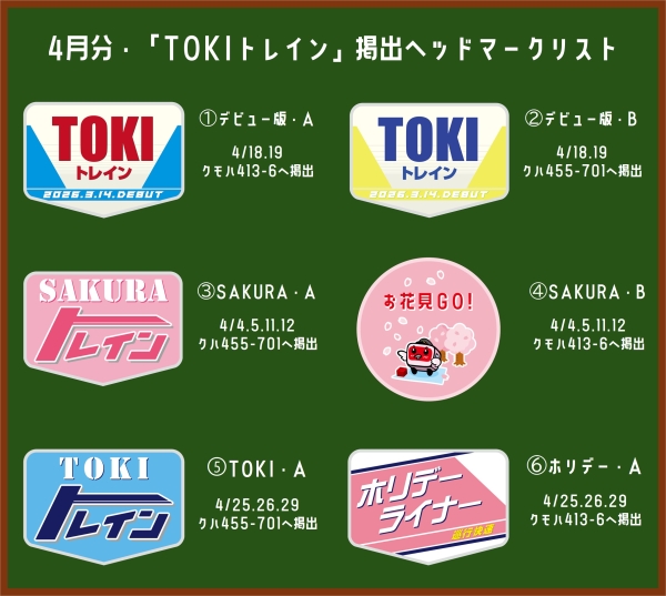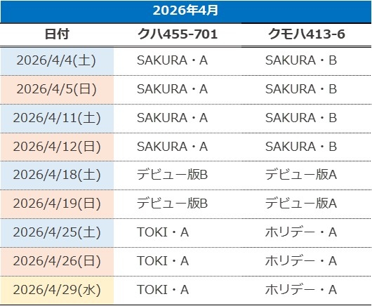 ※冬期間(概ね12月1日~3月31日を予定)と、413・455系「TOKIトレイン」車両の運休日については、