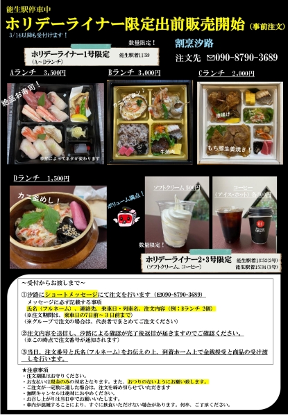 巡行快速「ホリデーライナー」運行日に能生駅前の「割烹汐路」さまによる事前予約制の出前販売を開始いたします。